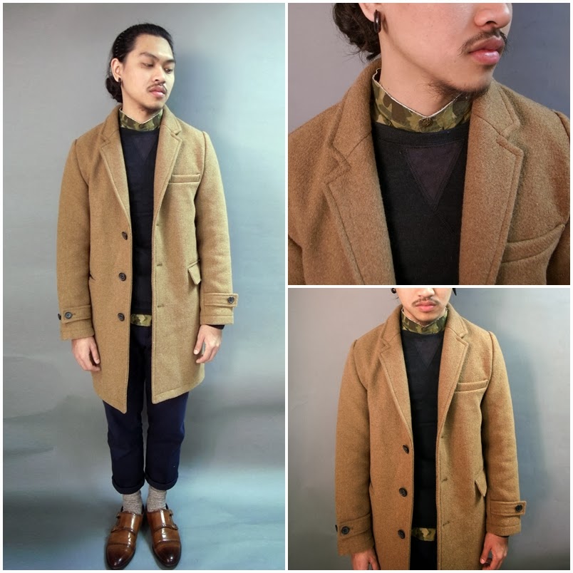 下圖中的迷彩襯衫去掉領片後,外加針織衫以及Chester coat,