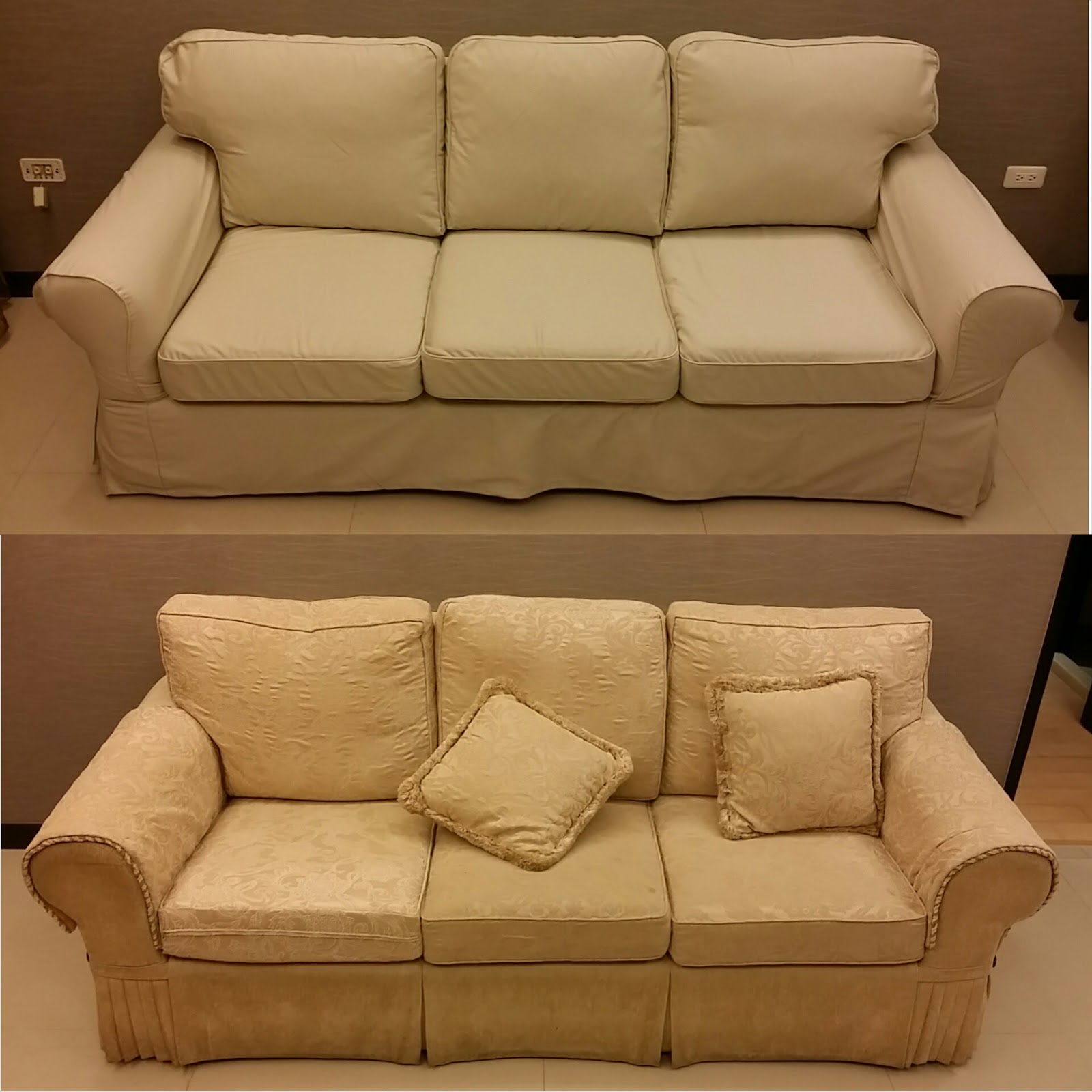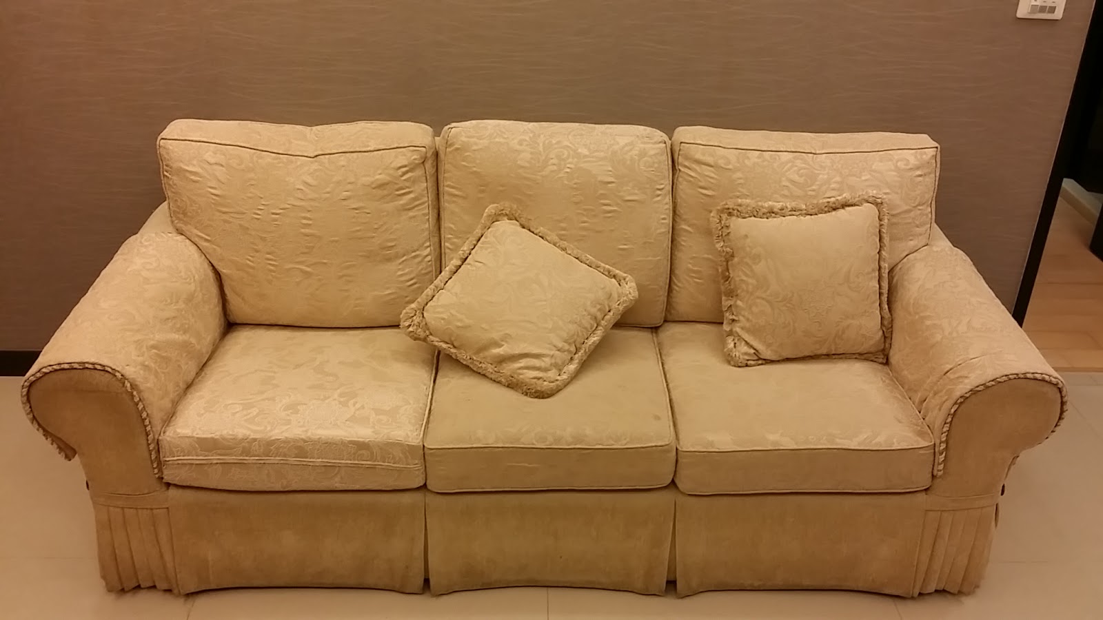 經過測量換上尺寸相仿的素面沙發布後,還它一個清白,