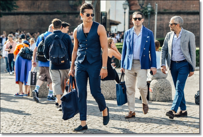 重點整理一下,所以一個完整的夏季紳士造型大概會有這些條件:敞開的胸膛 + 輕薄的材質 + 鮮豔的色彩 + 多元的配件 + 縮短的褲長
