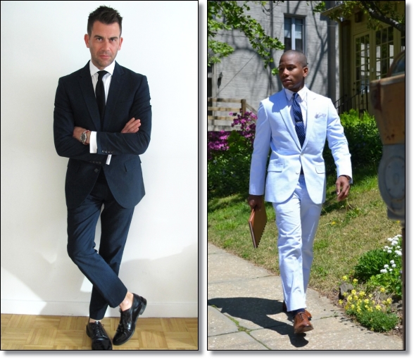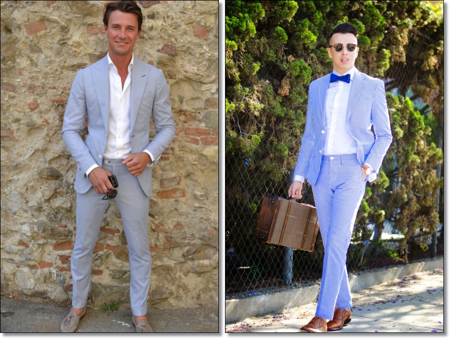 常見的泡泡紗通常會是淺藍、綠、灰或是大地色所組成,但往事總會有例外,就像連我都看不太出來左邊那件居然也是泡泡紗製成的西裝。搭配上的話你只需要當作他是一件更休閒的淺色西裝,搭上平時「夏天」會搭的樣子即可
