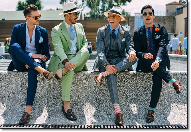 鮮豔的配色絕對是最佳解,也許看久了你會欣賞到中間那位老先生的細節、粉紅褲子仁兄的配色、或是最右邊游刃有餘的西裝穿法,但第一眼一定會先看到全身紅的這位先生。