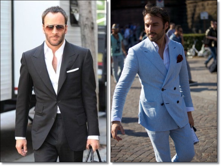 露出胸膛一直是Tom Ford(左邊)的招牌,他就是不愛打領帶;但有些人總會覺得沒領帶怪怪的,你希望不打領帶這件事情更自然一些嗎?,那穿得像右圖會是一個好的方案。
