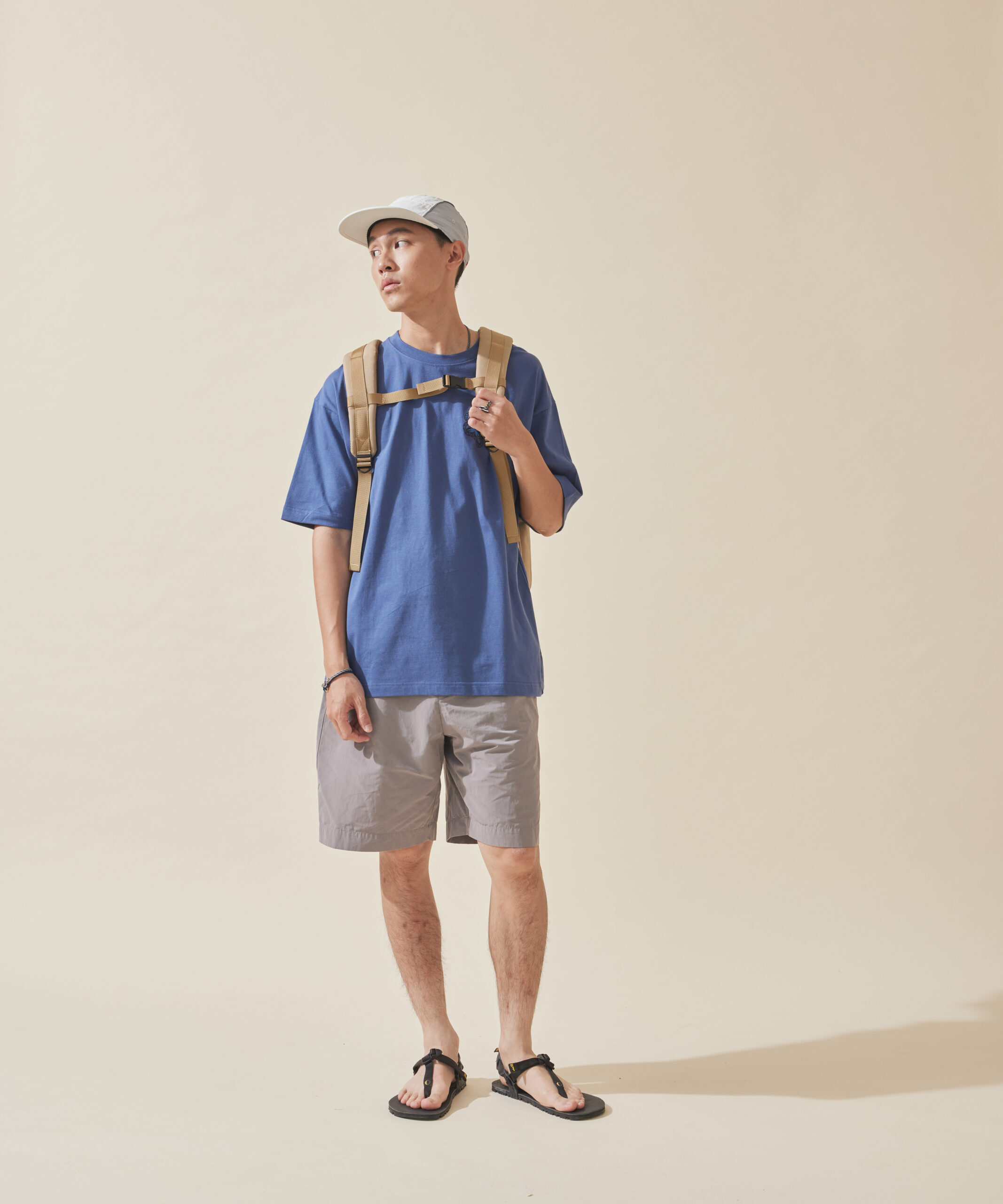 膝上褲穿搭寬鬆素 TEE,可顯得隨興又有休閒感,無論搭配拖鞋或包鞋,都能展現清爽有型的夏日風情。