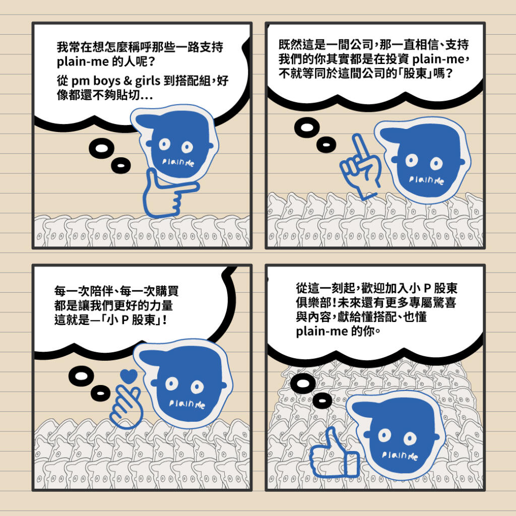 「小P股東」是 plain-me 選物品牌社群最核心的成員。未來,plain-me 將持續為這些懂搭配、也懂 plain-me 的「小P股東」們,提供更多專屬的驚喜與內容。