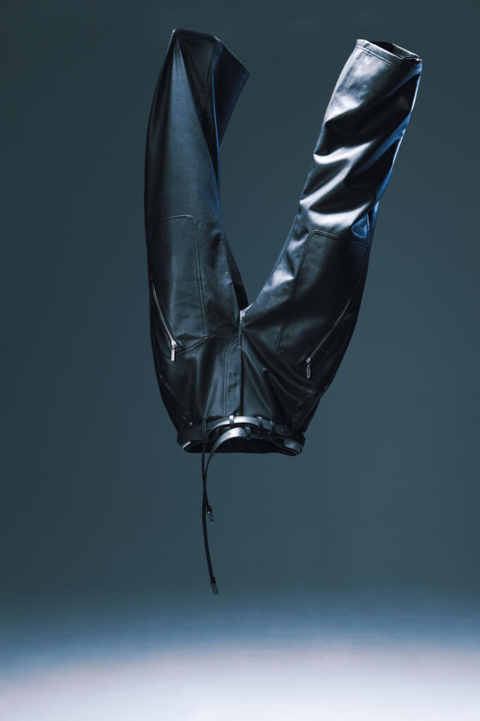 對比與錯位中,呈現不完美的平衡。 - melsign聯名皮感立領鋪棉外套、melsign聯名多口袋拉鍊皮褲:以人造皮革打造雙品牌首次嘗試的套裝調性,流暢的剪裁之下,藏著細微破壞的暗湧與張力。